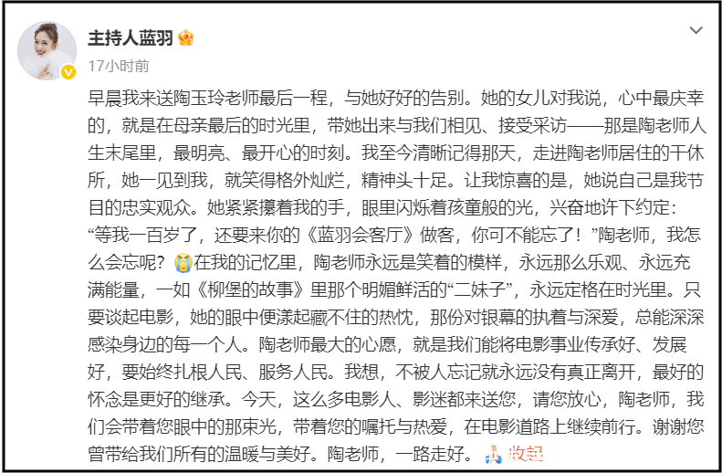 在告别仪式结束后,蓝羽发了一篇长文悼念陶玉玲。
