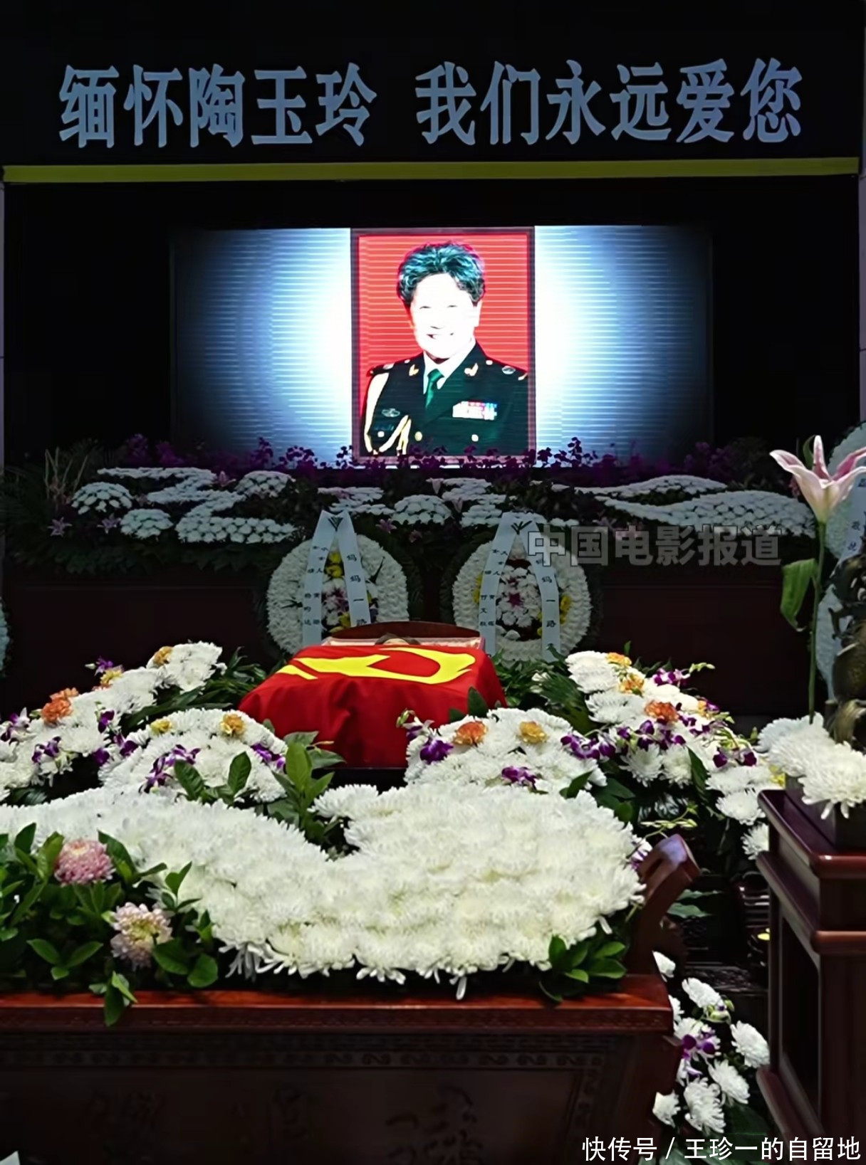 在灵堂的正前方的最中间可以看到陶玉玲的遗像。遗像的选择很讲究,并不是一张普通的个人照,而是一张军装照。